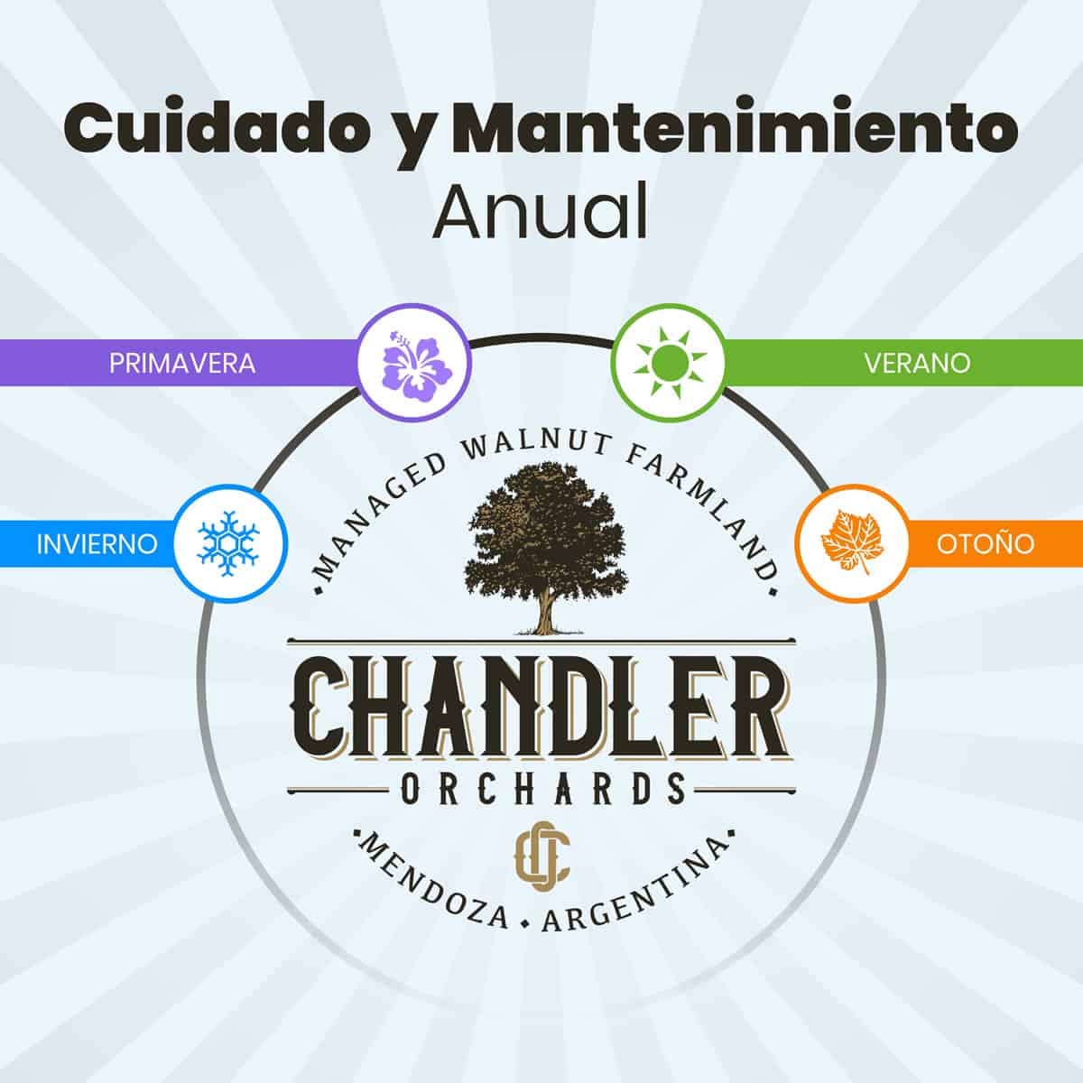 “Managed Walnut Farmlands” significa: administrado profesionalmente. El equipo de agrónomos, ingenieros agrícolas y expertos de Chandler Orchards, con sede en Mendoza, gestiona de manera profesional la plantación de nuestros inversores y se ocupa de todos los aspectos del cuidado y mantenimiento de todos los nogales y de sus respectivos lotes.